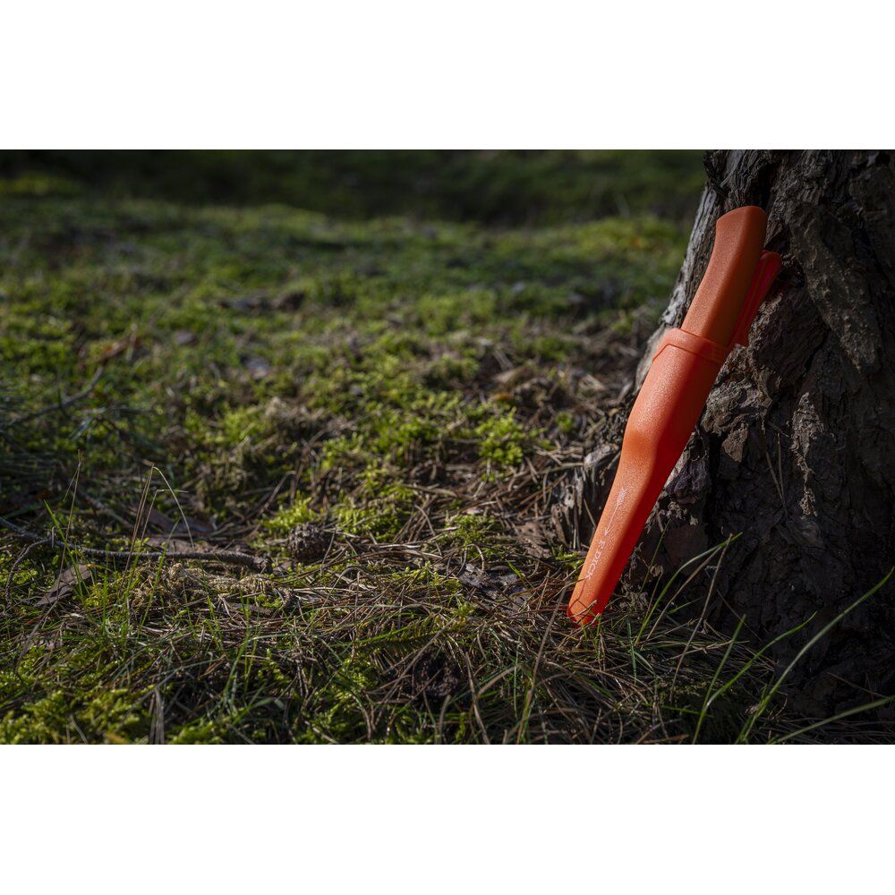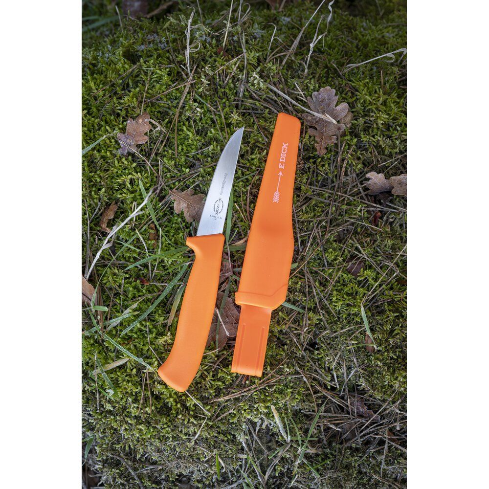 Das Jagd- und Geflügelmesser „ProDynamic“ von F. Dick ist ein zuverlässiges Arbeitsmesser für präzise Schneidarbeiten bei Wild und Geflügel. Die Klinge aus hochwertigem X45CrMoV15 Stahl mit 10cm Länge überzeugt durch ihre hervorragende Schnitthaltigkeit, Korrosionsbeständigkeit und einfache Nachschärfbarkeit. Mit einem Härtegrad von 56 HRC bietet das Messer eine gute Balance aus Stabilität und Flexibilität für den täglichen Einsatz. Der ergonomisch geformte Griff aus rutschfestem Kunststoff (Polypropylen und thermoplastisches Elastomer) liegt auch bei feuchten oder anspruchsvollen Bedingungen sicher in der Hand. Die auffällige orange Farbe sorgt zudem für eine gute Sichtbarkeit im Arbeitsumfeld – besonders praktisch im Outdoor- und Jagdbereich.