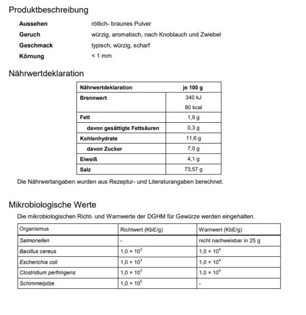 Zutaten: Speisesalz, Gewürze, Würze, Gewürzextrakte